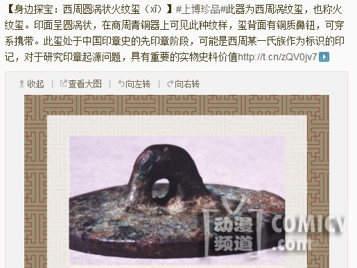 图片上所看到的是正经官方微博所发布的对于一款“西周圆涡状火纹玺(xǐ)”的介绍,初看第一幅大概只会以为是个锅盖神马的,然后看到第二张实印图就感觉有点不对了,看完所有图片,我擦,标准写轮眼啊?!