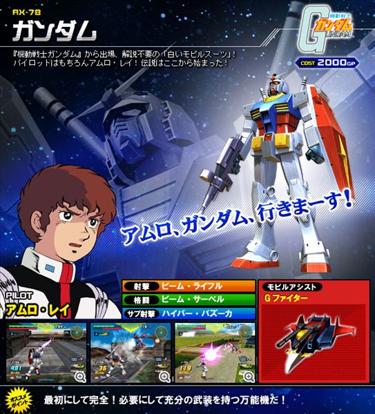 作为高达系列远祖中的远祖。高达给人的感觉就是简单,扎实。没有什么变形,换装等花哨的技能。但是四平八稳,没有明显的弱点。射击,格斗性能良好,特别是格斗性能,距离延长,出招速度,都在中上水平,格斗攻击力在2000机中处一线。射击性能上,武器种类丰富,弹数不成问题,最简单的射击Combo A、AB 简单且王道。是射击、格斗两立的万能机体。如果是本着想真正玩好本作的话,入门机用高达将会是一个不错的选择。