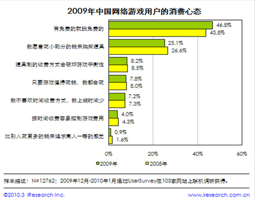 在问及用户的消费心态时,有46.8%的用户选择“有免费的就玩免费”选项,比08年高出3个百分点,另有25.1%表示“愿意花小部分的钱购买道具”,而选择“愿意花钱追求高人一等感觉”的极端用户仅占总数的0.9%。