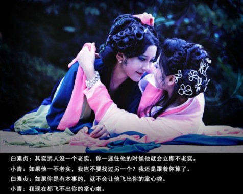 美艳成熟的白蛇,媚情顽皮的青蛇,幻化人形来到世间。昆剧的妆容,在一片郁葱丛的荷花淀更显得妩媚风情。偶遇许仙,爱意萌生,便有了之后的故事。故事从青蛇的不懂爱开始,懵懂、找寻。端午显性,书生吓破胆。接下来好似传说中那般情节,青白蛇共赴昆仑山寻求灵芝仙草以救许仙俗命。大战法海,水漫金山,白蛇产子,直到青蛇最后流下一颗名叫做“明白”的眼泪。影片没有出现文弱书生许仙特写,仿佛他的存在只是青白两个语言的道具一般。有的只是青白两人柔肠百转的心事,以及烟雨缥缈,雾霭朦胧,宛若人间仙子的一双倩影。
