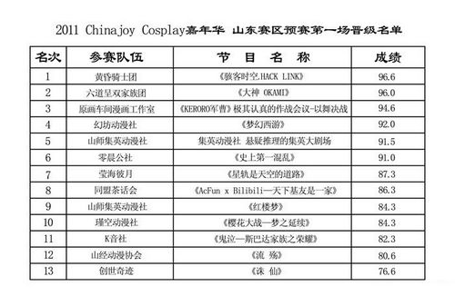 经过4月16、17日两天的激烈角逐,2011 ChinJoy Cosplay嘉年华山东赛区的第一场预赛终于有了最终结果。13只本地团队脱颖而出,获得了4月30日至5月2日的山东赛区地区决赛入场券。第二场预赛将在4月30日举行,来自山东各省的团队将齐集山东省科技馆进行,争夺进入分赛区决赛最后的机会。