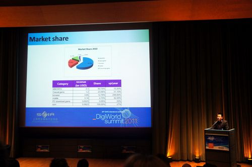 席间,协会秘书长明豪侠先生以深入浅出的形式和完整翔实的统计数据,就“中国游戏产业现状及未来发展前景”于电子游戏高峰论坛上进行了30分钟的现场发言,并与互动艺术与科学学院主席Joseph OLIN先生,Facebook的伙伴关系主管Julien CODORNIOU先生及Bigpoint的首席游戏官Philip REISBERGER先生等四人,就“社交网络是否将成为第二个电子游戏平台”的话题进行了1小时颇有见地的讨论,睿智的言语和诙谐的幽默引得现场超过250名观众频频爆发出热烈的掌声。