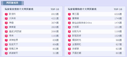 首先玩家最喜爱的十大网络游戏榜单中“九阴真经”“倩女幽魂”“地下城与勇士”始终占据前三甲的位置,不难看出玩家们对这三款游戏的情有独钟。而人气颇高的“剑侠情缘3”则被“成吉思汗3”和“画皮II”赶超,看来是处处不可松懈。玩家最期待的十大网络游戏榜单中“黑金”再次夺魁,一拥而上的“圣斗士星矢”“EVEonline”等游戏则在后方虎视眈眈随时有赶超的可能。最佳原创网络游戏榜中“斩魂”暂时领先,但以“九阴真经”和“成吉思汗3”的增长幅度来看之后可能又是另一番景象。最佳境外网络游戏榜中变化不大,“洛奇英雄传”稳居首位,而“梦幻诛仙2”则在最佳Q版网络游戏榜中遥遥领先,居后的游戏压力可想而知。页游方面“卧龙吟”“大侠传”“神曲”等游戏在玩家最喜爱的网页游戏榜上暗暗较劲,同时在玩家最期待的网页游戏榜上首位的“萌三国”则被黑马“童萌镇”紧追不舍。手游部分在最佳移动平台游戏榜单中“海扁西游记”和“捕鱼达人”始终在冠、亚位上争夺输赢,而“博雅斗地主”则逆流而上,占领本周最佳移动平台游戏榜首。