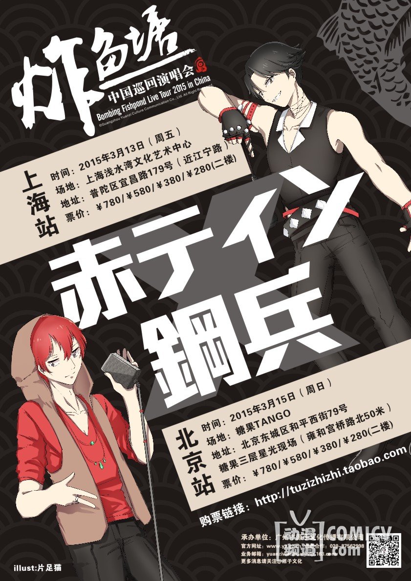 去年国内知名的日本动漫演唱会主办方源子文化成功把人气唱见红婷婷和钢兵邀请到中国广州并成功举办了“Bombing Fishpond Live”,获得了众多的粉丝大力支持。他俩决定继续前行 “Bombing Fishpond Live”又名“炸鱼塘演唱会”准备在多个城市进行巡回演出,让各地更多的粉丝可以跟婷婷和钢兵近距离接触,点燃这热潮!Bombing Fishpond Live Tour 2015 在此拉开序幕。
