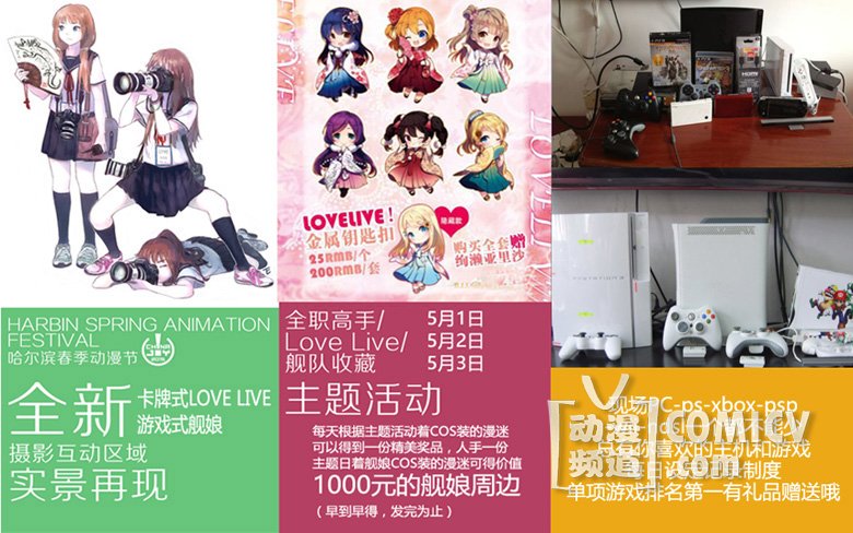本次的摄影区将会推出最新的实景摄影方式,对应我们每日不同的主题日活动(主题日活动请往下看)主打舰娘,lovelive主题,打造APP卡牌效果实体摄影区,并在主题日穿符合主题的COSPLAY服装还可以得到超棒的礼品哦,舰娘1000元手办礼品数量有限,早到早得,幸运观众们可与熊爪服务台领取哦。更有全息投影技术正在研发中,届时全息动漫人物全免费全景来到你身边,与你爱的那个“她”近距离接触吧!此次历经半年研发的“暗芝居”即将揭开神秘的面纱,大家会在展会现场体会到不用的鬼屋世界。更有模型展、萌宠屋继续之前的精彩,酷品堂模型展继续带来最新的展示品及参与性极强的现场拼装模型赛,还有各种抽奖等参与性活动等着喜爱模型的各位来亲自体验。而萌宠屋则除了仓鼠、龙猫、兔紫、豚鼠(荷兰猪),小猫和狗狗以及蜥蜴光临还增加了更多的神奇“小伙伴”们,届时等待你的围观领养。现场游乐区体感-PC-ps-xbox-psp-wii-ndsl一个都不能少。总有你喜欢的主机和游戏,每日设定记录制度,单项游戏排名第一有礼品赠送。老牌游戏套圈、捞金鱼、二次元雀战继续让大家体会着这次“有别不同”春季动漫节。H2O同人展更索罗全国,将带来最新的同人本发售,更多大卡新本我们将在二宣公布,全新品牌、DIY动漫周边让我们在五一买买买!伴着青春的五一,花海与人流相映生辉,不要再宅在家里,赶快成为2015年哈尔滨CJ的一份子共同参与其中吧!#熊爪动漫##15年哈尔滨CJ#互动抽奖话题微博正在展开!