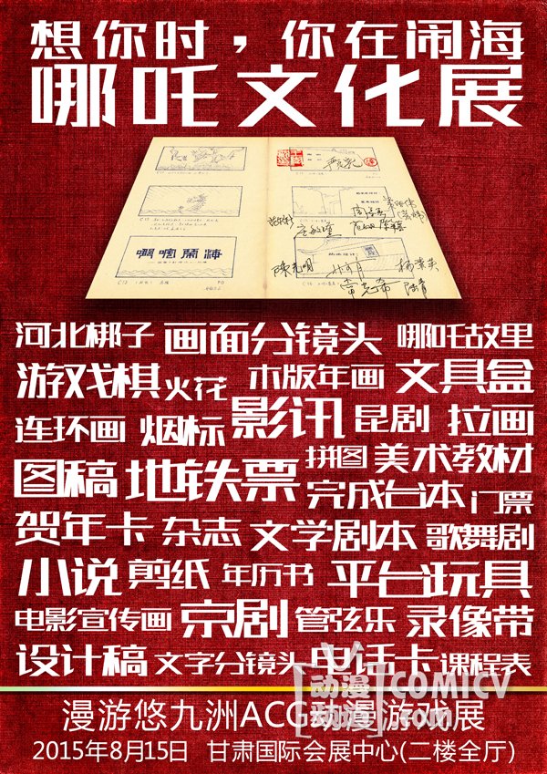 漫游悠动漫游戏嘉年华第三季暨九州ACG动漫游戏展,将于2015年8月15日在甘肃国际会展中心豪华开幕。本届展会的特色之一是主办方兰州IM文化将携手空藏动漫资料馆共同“中国动漫展中展”之“想你时,你在闹海——哪吒文化展”。据介绍,哪吒文化展对哪吒文化进行了系统的梳理,展出年画、小说、烟画、插画、门票、戏剧、火花、连环画、明信号、曲谱、剧本、烟标、画片、电话卡、图书、课本、海报、动画片画面分镜头、文具盒、录像带、课程表、桌游卡牌、木偶等百余件与哪吒相关的民俗艺术、实用品和各类资料。