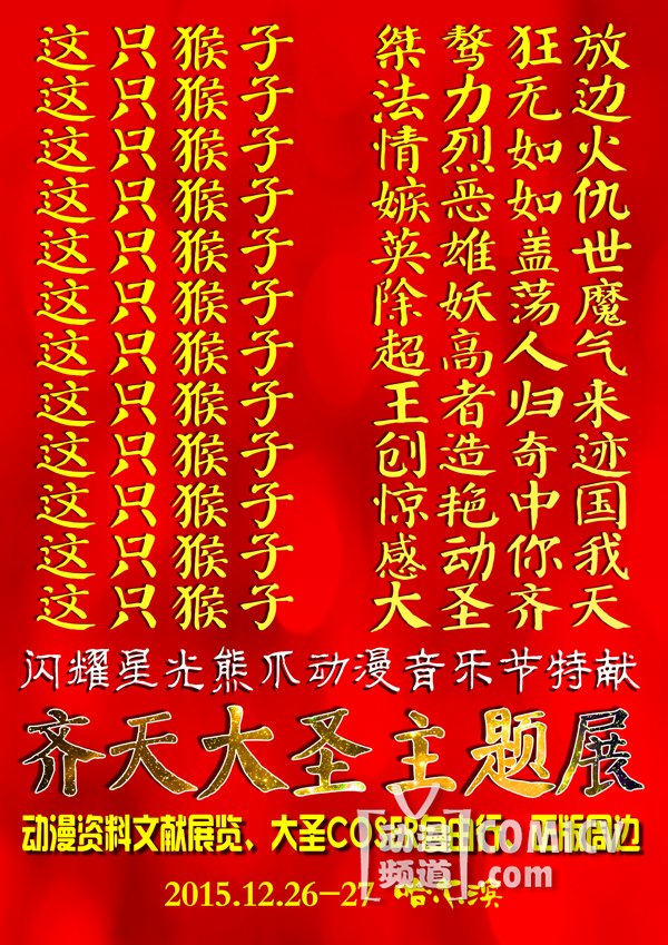 齐天大圣主题展对中国、日本、美国、韩国等国家的漫画、电影动画、动画电影中出现的孙悟空形象进行了收集、归 类、总结,用图片、文字、实物资料进行全面回顾和梳理。在特展现场,小伙伴们可以看到有关孙悟空形象的各类动 漫作品资料档案、周边玩具等实物。特别是一些经典动画片的分镜头剧本、画面分镜头台本、完成台本都是第一次在 哈尔滨公开展出。还有各类海报、剧照说明书、连环画册、录像带、磁带、光盘、书签、文具盒、火花、电话卡、邮票、平台玩具等各类周边实物。这些材质多种多样、造型各式各异的孙大圣、小空空们在星光动漫音乐节恭候大家,与大家共庆2016新年,共迎猴年新春!
