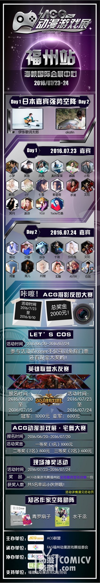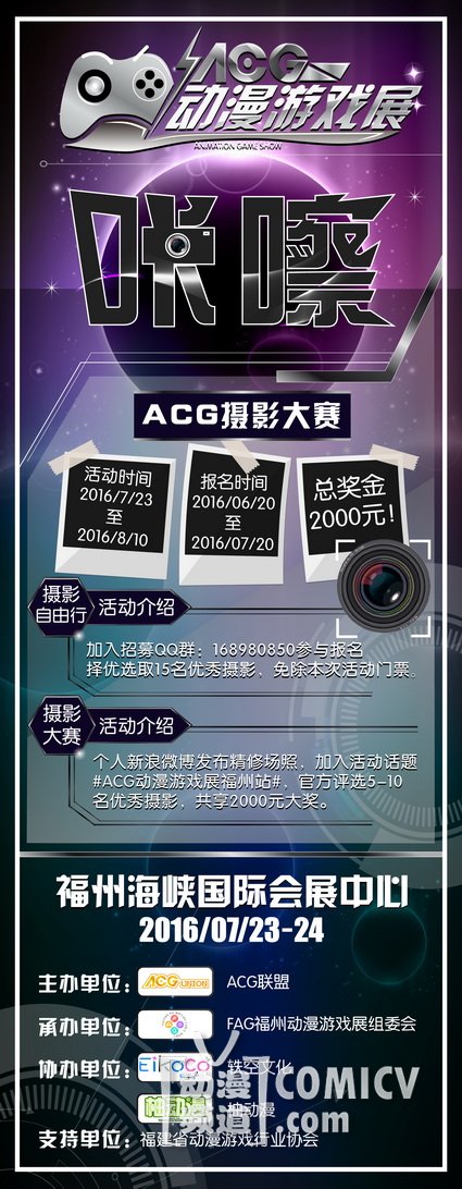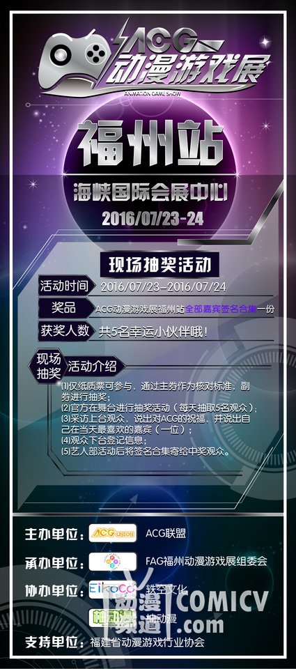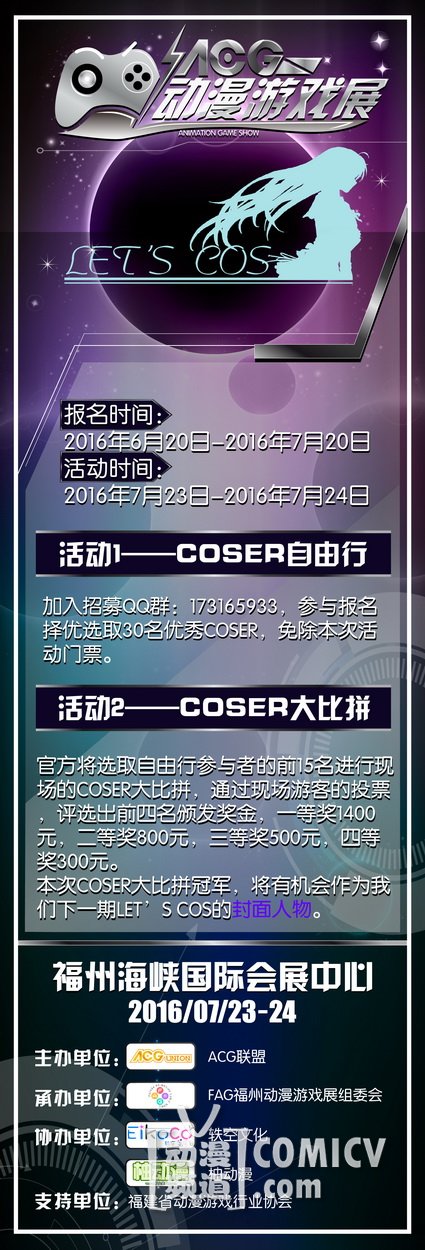 由ACG联盟主办,FAG福州动漫游戏展组委会携手轶空文化、柚动漫倾情奉献,ACG动漫游戏展,将于7月23-24日在福州海峡国际会展中心与广大动漫游戏爱好者私会两日,郎妾咸聚。当然在展会现场我们依然邀请了深受大家喜爱的二次元嘉宾与大家深入搞基~还不赶叫上你的小伙伴约过来!