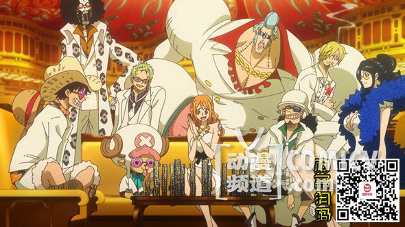 片头,路飞以头戴红色航海帽,身上背着一把巨型斧头的造型登场,与印象中的经典草帽截然不同,充满喜感的服装,实在令人忍俊不禁;而来到娱乐都市大德索罗号的草帽一行人,似乎为了隐藏身份都大换服装,其中撒谎布延续一贯的浮夸搞笑装扮,而乔巴戴着熊猫头套的造型更是呆萌可爱。