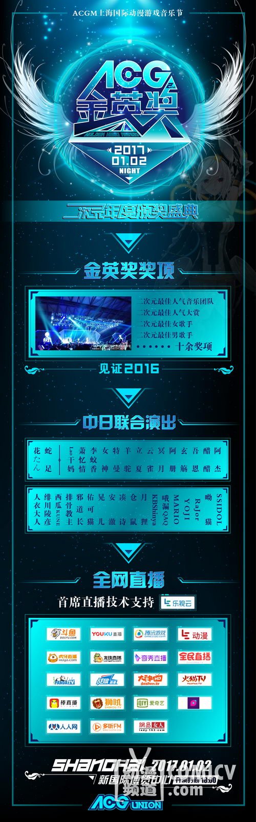 ACGM上海国际动漫游戏音乐节2017.01.01-02将于上海新国际博览中心E1馆 震撼来袭!大型二次元年度盛会,两天漫展,福利满满!耽美/国漫/电竞等特色专区,诸多品牌震撼亮相,玩转元旦!2号晚场【第二届“ACG金英奖”颁奖盛典】十多个重量级奖项花落谁家?更有演唱会环节,众星加盟!中日联合!燃爆魔都!