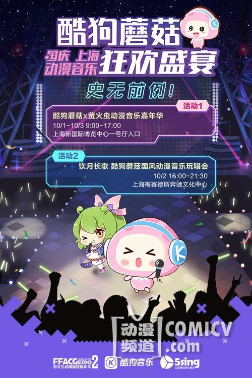 除了这一热门活动外,国庆期间,酷狗还火力全开,接连在上海举办音乐盛宴。10月1日-3日,酷狗蘑菇X萤火虫动漫音乐嘉年华降临新国际博览中心,届时国内知名青春偶像组合SING女团、刺客团等明星现身助阵。而2日晚上,酷狗蘑菇国风动漫音乐玩唱会将会登陆梅赛德斯奔驰文化中心,与知名COSER茨木、猫少、兔小爷,古风唱将晃儿、不才,以及“内地乐坛甜美女音”印子月等艺人,上演一场视听盛宴。
