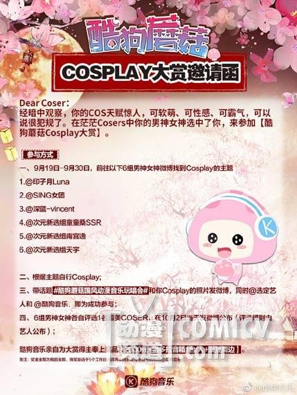 9月19日,酷狗携手印子月、SING女团、深蓝-vincent、次元新选组童童桑SSR、南宫逸、天宇一众明星,发起【酷狗蘑菇Cosplay大赏】活动:只要Coser按照规则发布微博,即有机会获得【2000元现金+潘多拉音响1台+爱豆周边】重磅大奖。