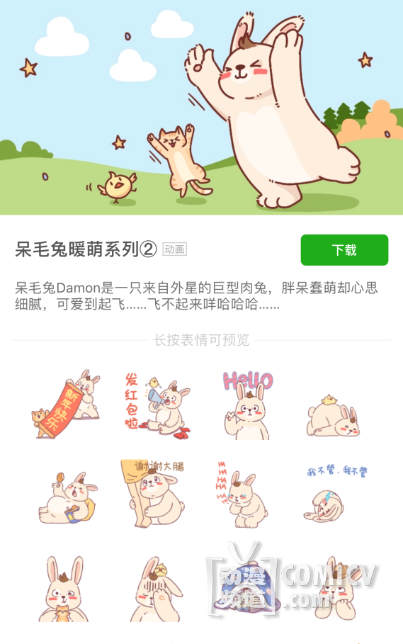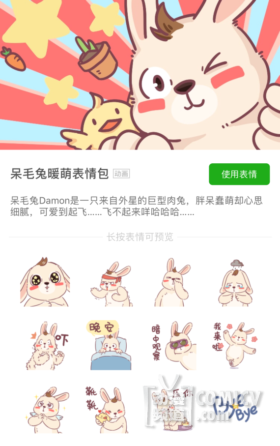 除了常见的“呆毛兔Damon”漫画形象外,你也能在日常生活中“拥有”这只大胖兔。现已登陆微信表情中的两款“呆毛兔暖萌表情包”,可以让你在微信聊天时随时感受到它带来的幽默与呆萌。