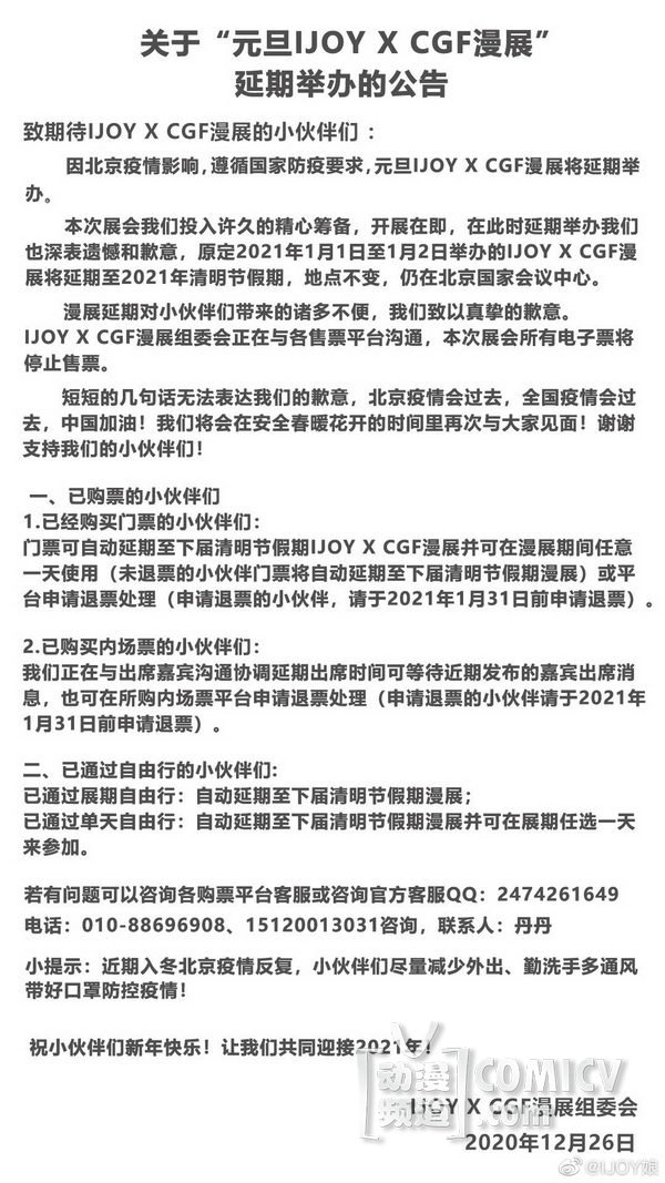 亲爱的小伙伴们,因北京疫情影响,遵循国家防疫要求,2021年元旦IJOY X CGF漫展将延期举办。将延期至2021年清明节假期,地点:北京国家会议中心,谢谢支持我们的小伙伴们!我们 2021年春暖花开见! ​​​